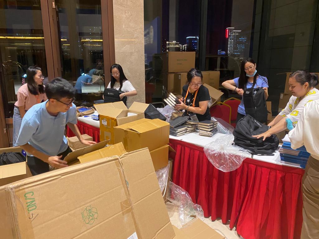 会议前一天,会务组人员提前到达会场,实地考察,做好会议资料装包、桌牌摆放、展板安装等工作。