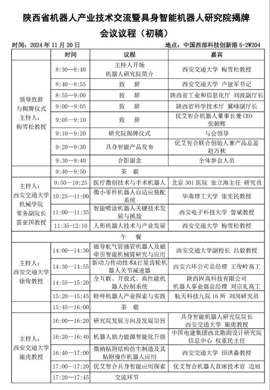 院揭牌暨机器人技术交流会议暂定于11月20日8:30在中国西部科技创新港5-2W204举办,拟邀请两院院士、省市领导、产业重点企业代表等100多位嘉宾出席。