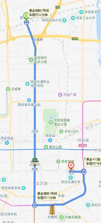 公交车:乘坐地铁2号线,北客站上车,小寨站下车,换乘地铁3号线,咸宁路站A出口下车,步行160米至金花南路公交站上车(402路或教育专线),兴庆公园站(兴庆公园南门)下车,过马路进入交大北门,经梧桐东道向南步行150米到达会议地点科学馆。